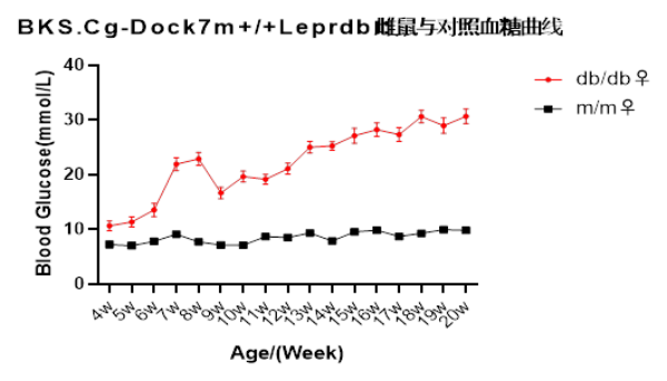 品系描述: db基因為4號染色體隱性突變基因,能導(dǎo)致肥胖伴糖尿病,純合子有高血糖癥;其瘦素受體基因失去功能,純合的糖尿病自發(fā)突變小鼠在出生后2周內(nèi)就發(fā)生高胰島素血癥,血漿胰島素開始升高,在3-4周齡時產(chǎn)生可以辨認(rèn)的肥胖表型,4-8周血糖升高,同時胰島素分泌增加至正常值的數(shù)倍,但組織中的胰島素受體明顯少于正常,并且受體的結(jié)合力也低于正常,8周后就發(fā)展為非常嚴(yán)重的高血糖癥,血糖可高達(dá)400mg/dL以上,期間伴有胰島素抵抗,β細(xì)胞功能衰竭,一般在8~10個月內(nèi)死亡,臨床癥狀和病程比ob / ob更嚴(yán)重,壽命更短;純合小鼠多食、多飲、多尿,且純合db/db小鼠不育。
